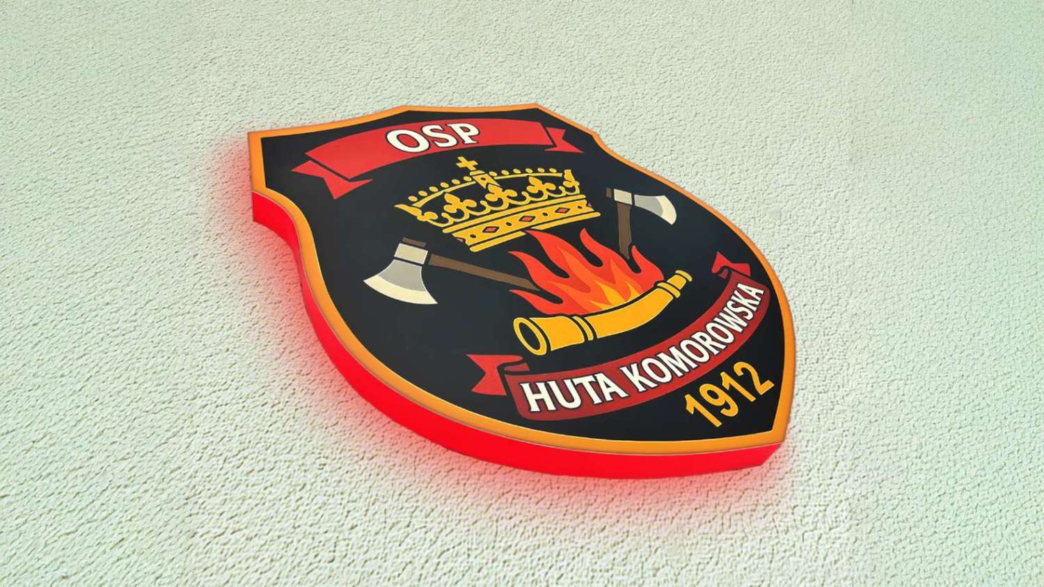 szyld 3D LED OSP | świecący kaseton | świecący herb OSP | oznakowanie remizy strażackiej | kaseton plexi herb | reklama świetlna OSP | identyfikacja wizualna jednostki straży pożarnej | oznakowanie OSP