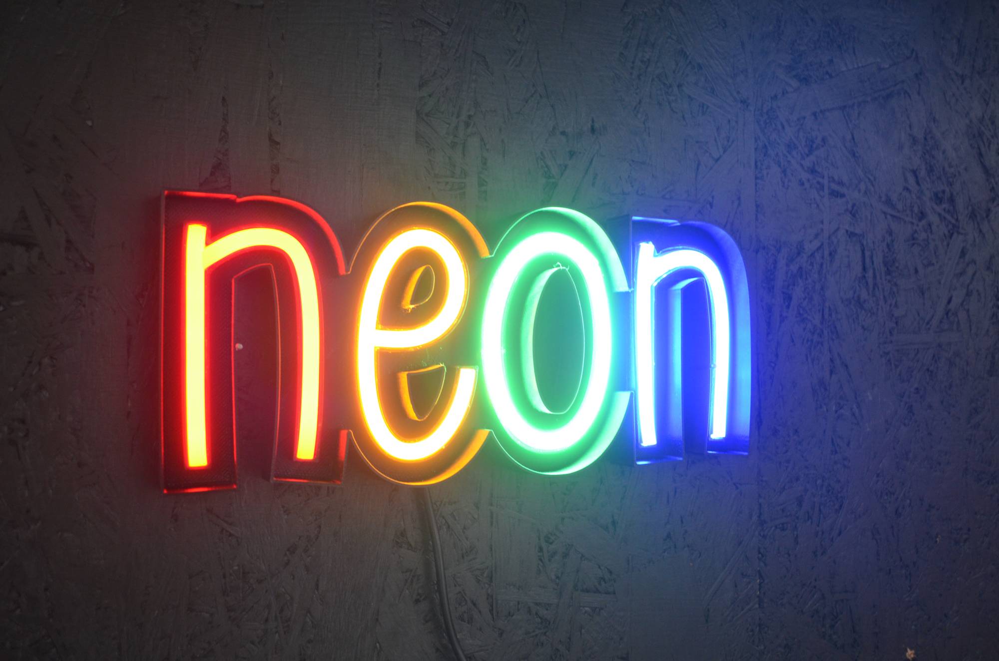 - każda litera świeci osobnym kolorem, co wzmacnia efekt przestrzenności i głębi.