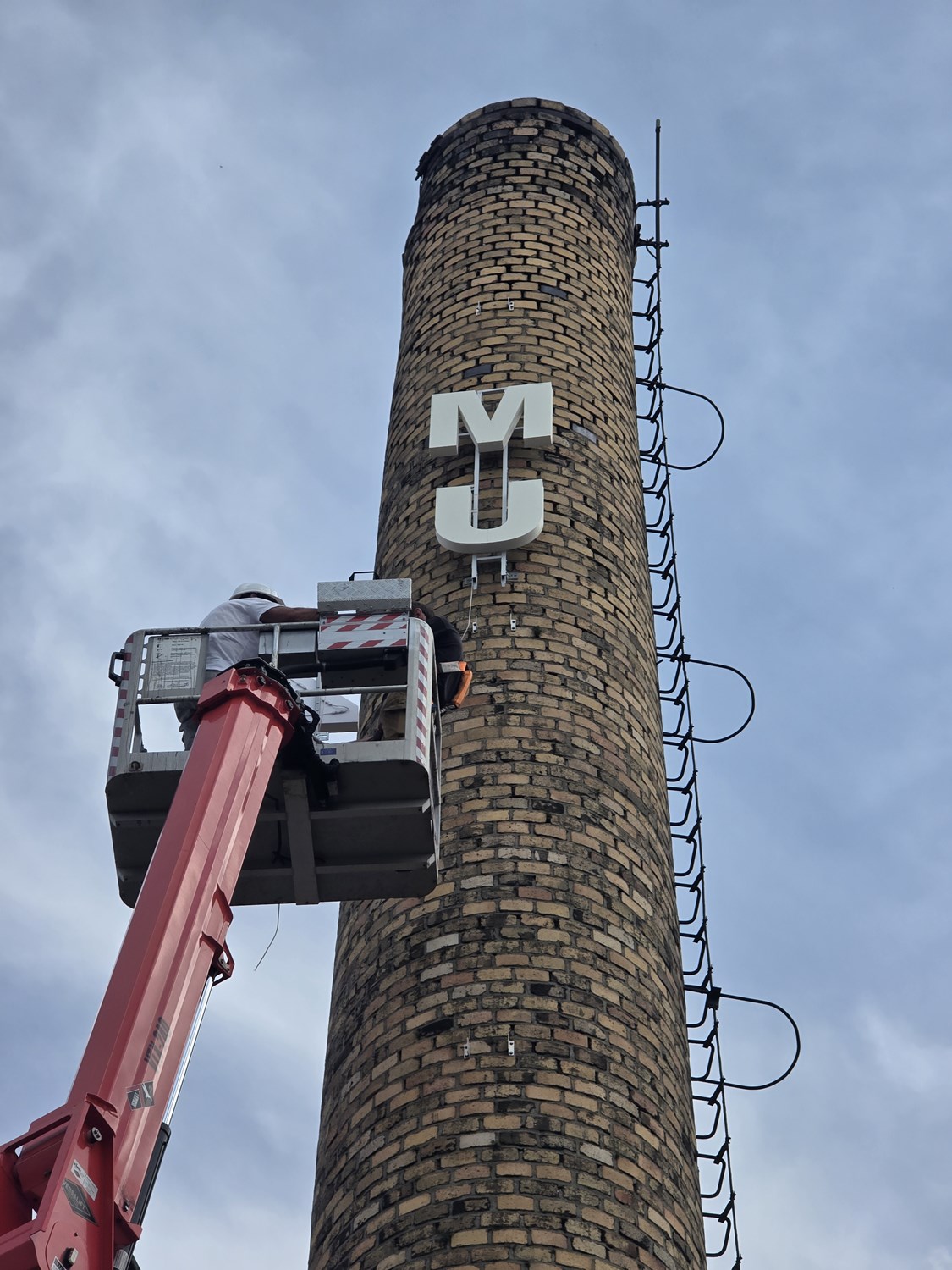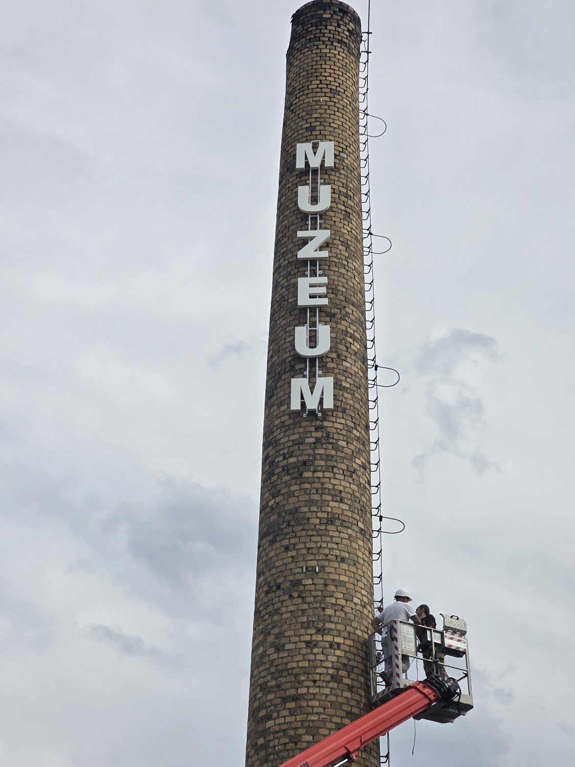 Nasza praca była częścią dużego projektu, który uwzględniał produkcję wielkoformatowych liter przestrzennych niepodświetlanych, dwuwarstwowych (styrodur + PCV), które finalnie zostały zainstalowane na kominie ceglanym.